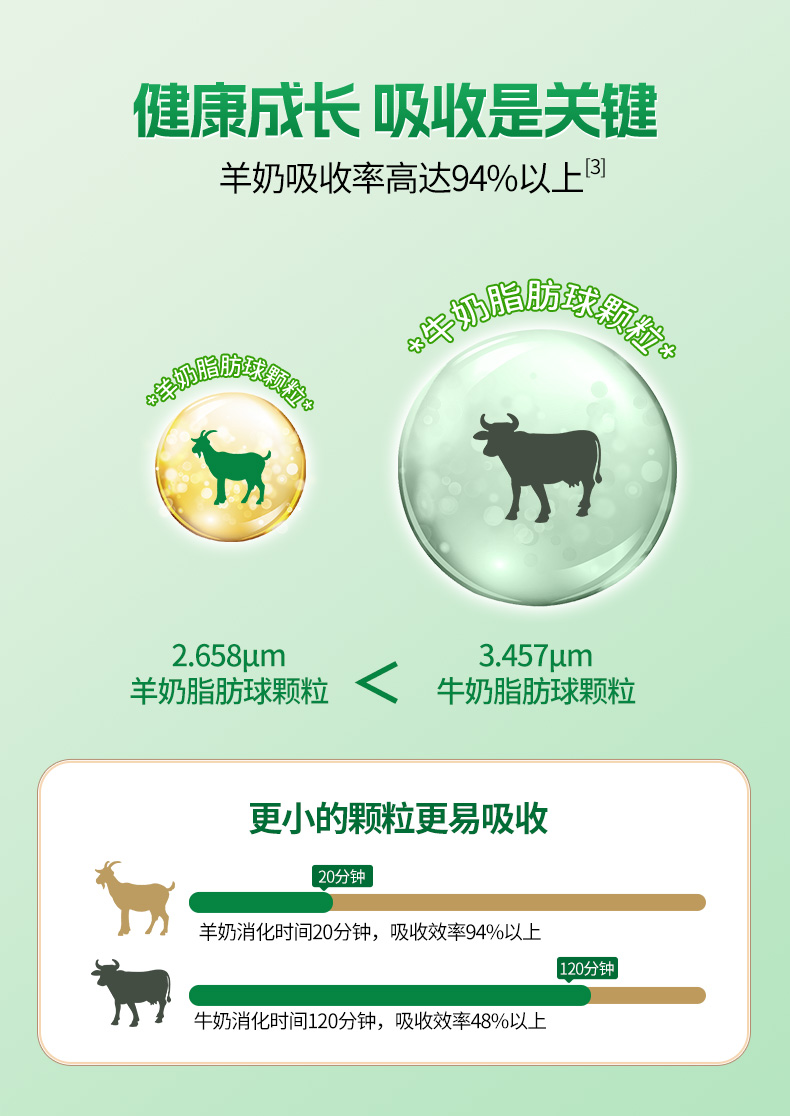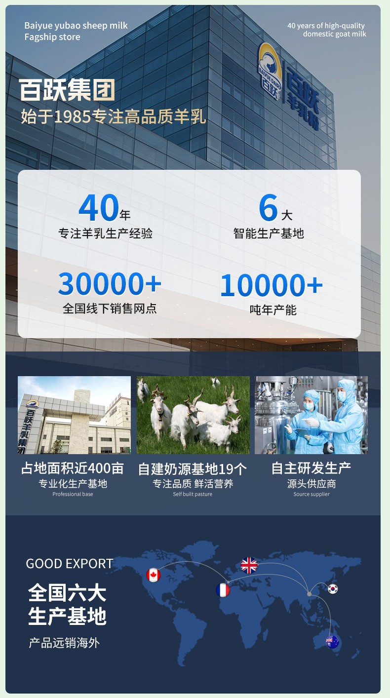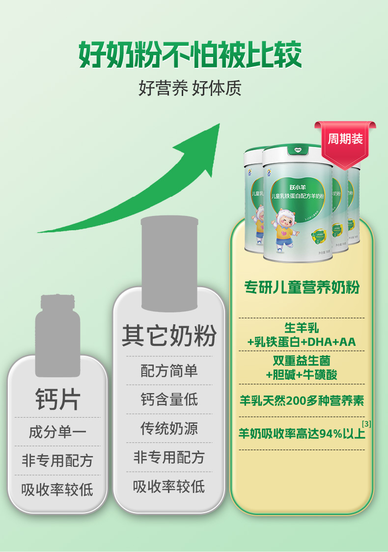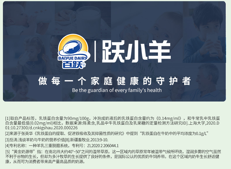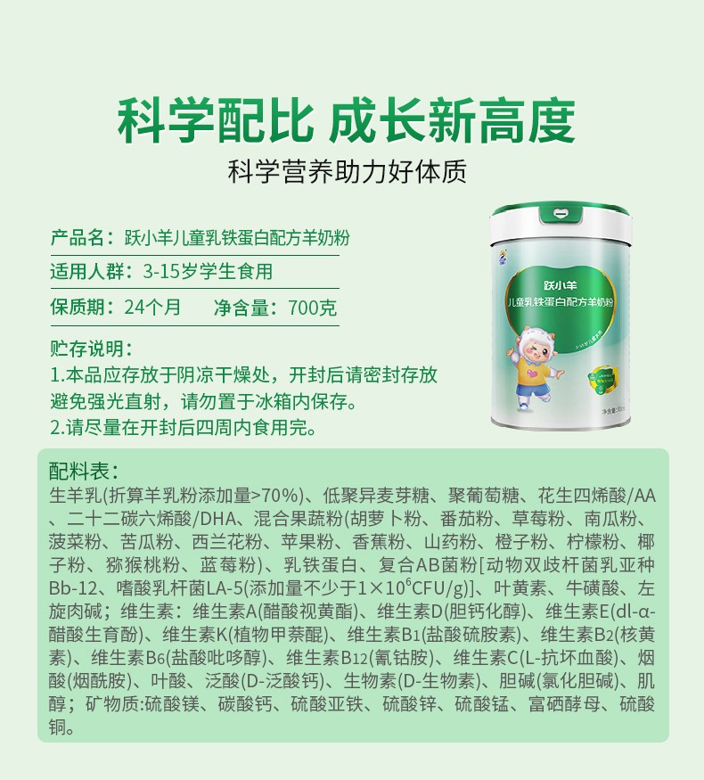 百跃跃小羊儿童乳铁蛋白配方羊奶粉,专为3-15岁儿童提升自护力而研发,在调制乳粉新国标之上,严选北纬34°八百里秦川天然牧场的优质新鲜生羊乳为原料,采用先进的低温喷雾干燥技术,2小时一次锁鲜成粉,生羊乳添加量70%以上,奶基有且只有生羊乳,高钙配方,高效吸收!针对儿童免疫力所需,特添加: